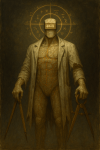 From these fingerprints arise Monstrosities — symbolic anatomies of error. They are not literal beasts, but visual portraits of distortion: a ribcage cracking into a cage, a mirror face splitting into false identities, a crown warping into jagged domination.